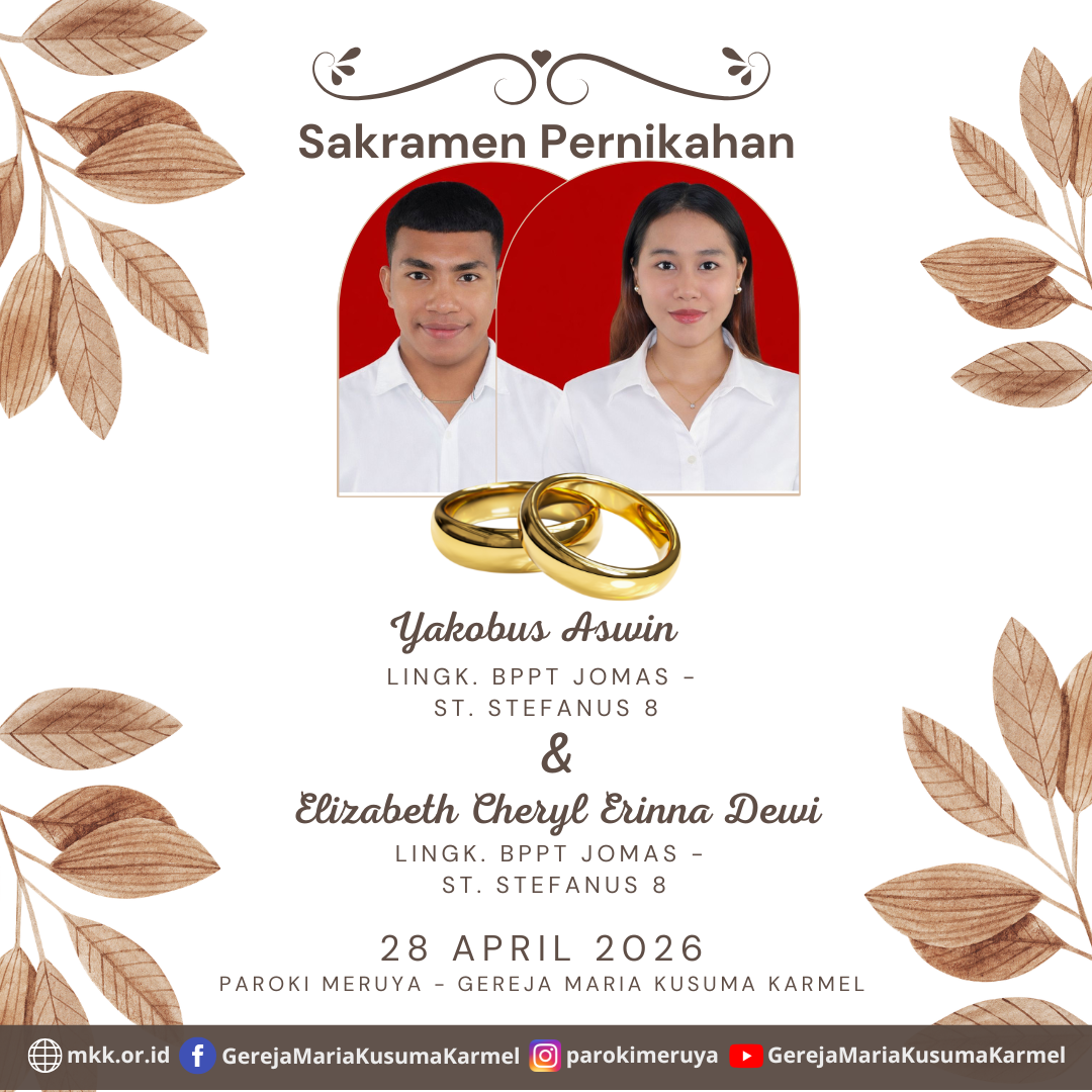 Berikut diumumkan, calon pengantin yang akan mengadakan Sakramen Pernikahan Antonius Denny Adinugroho dengan Eugenia Regita Ollivia Pada tanggal 25 April 2026 di Paroki Katedral - Gereja St. Perawan Maria Diangkat Ke Surga, Jakarta.