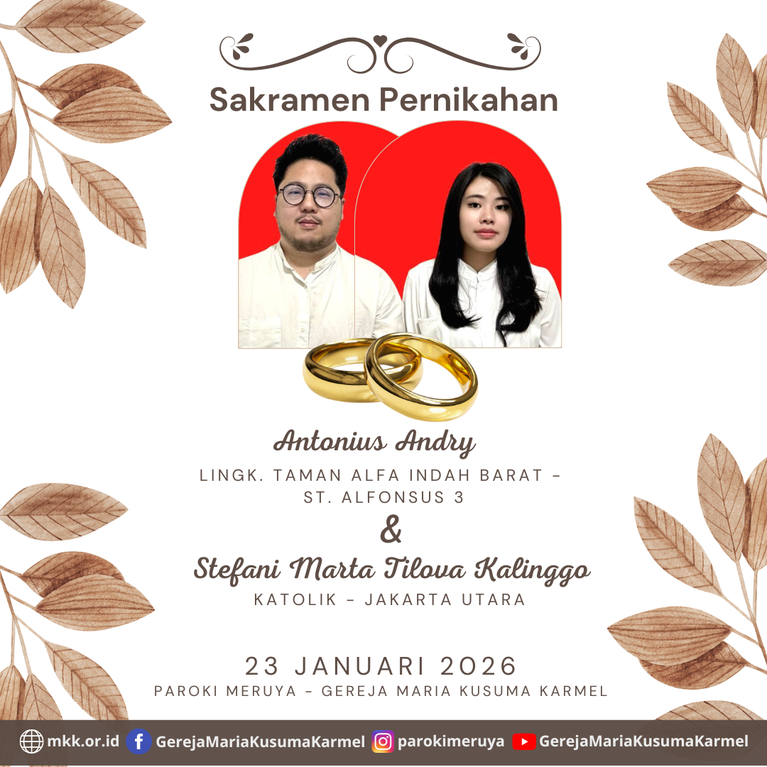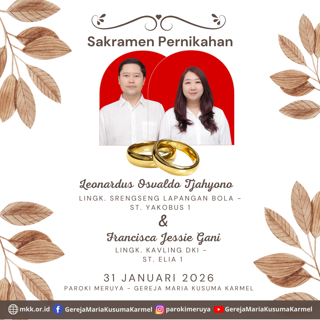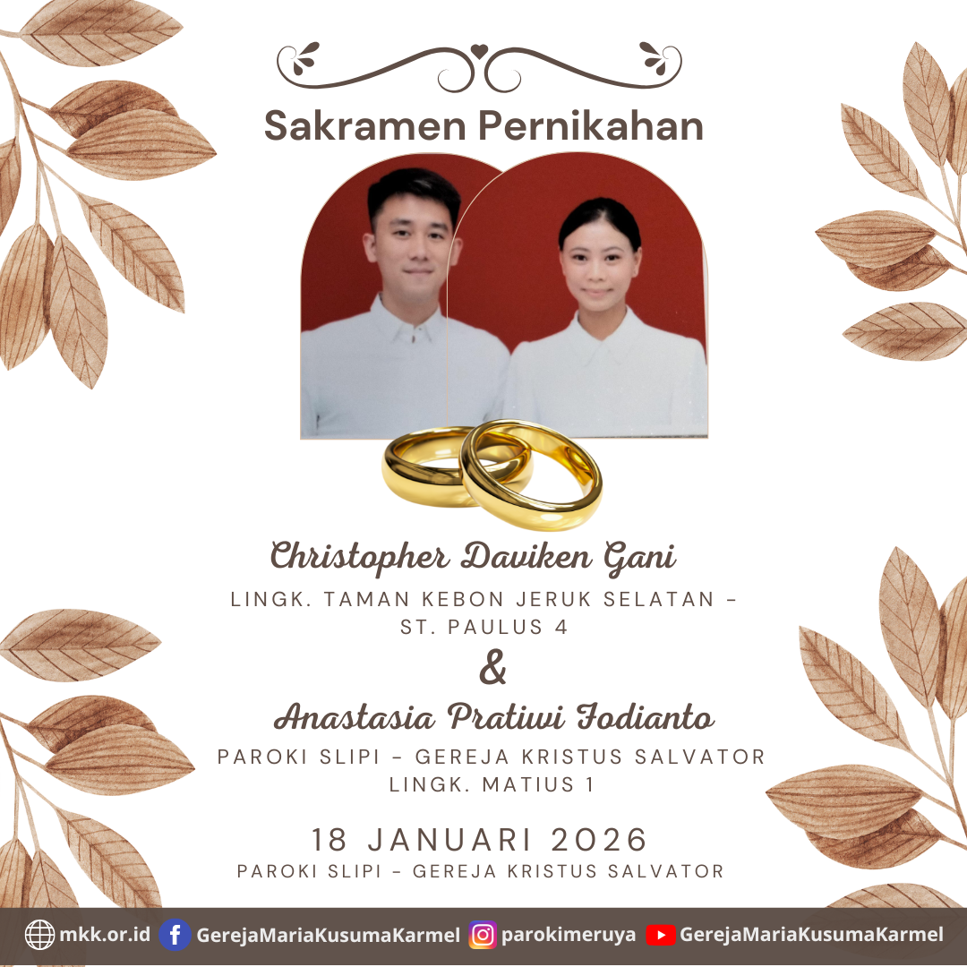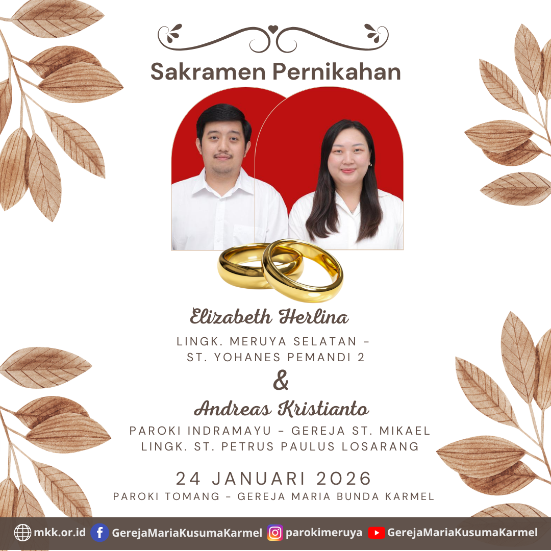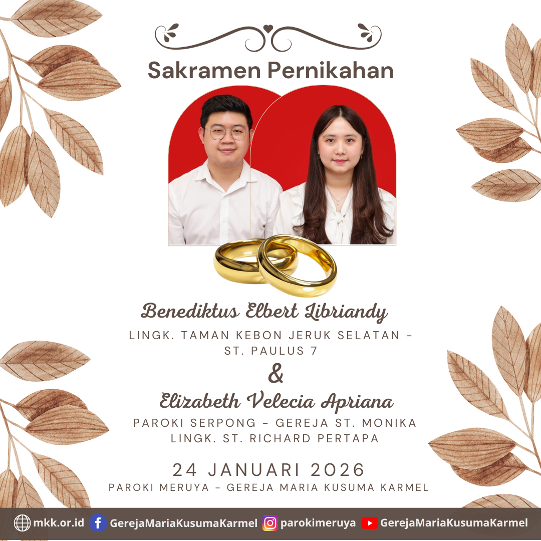 Berikut diumumkan, calon pengantin yang akan mengadakan Sakramen Pernikahan Ignatius Bernado Januar dengan Felicia Angela Pada tanggal 17 Januari, 2026 di Paroki Meruya - Gereja Maria Kusuma Karmel.