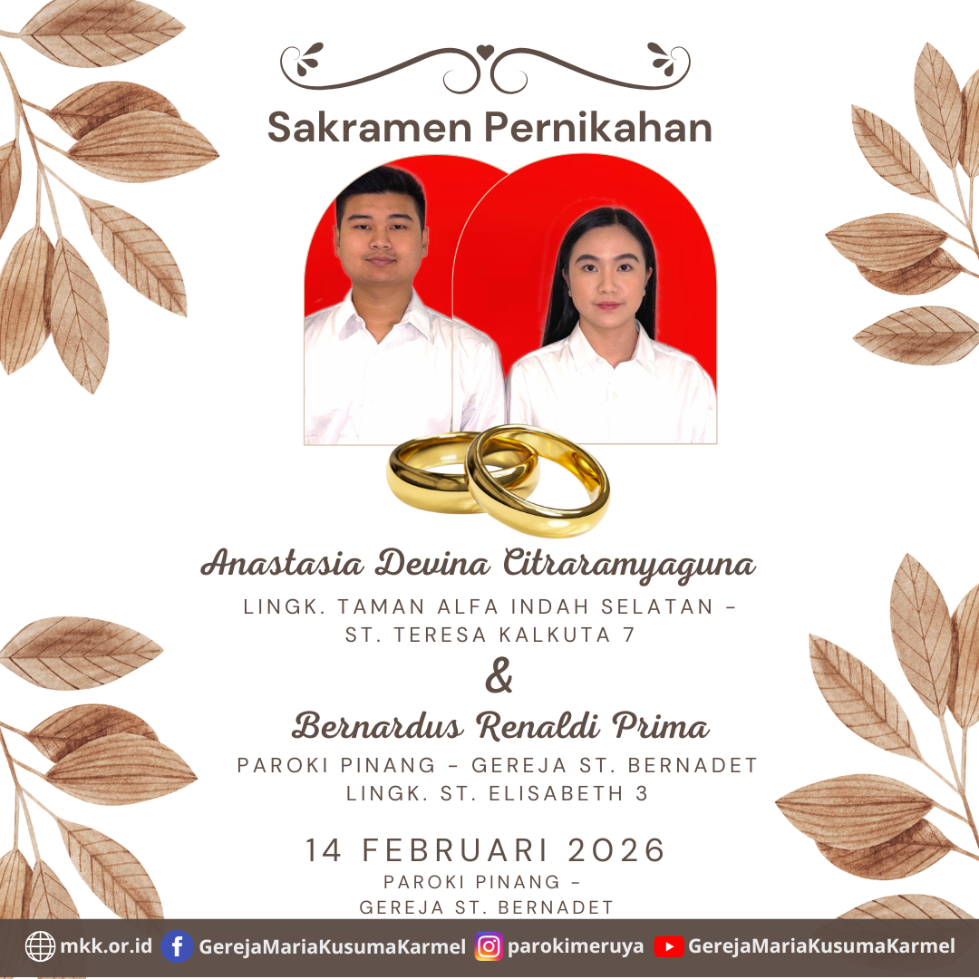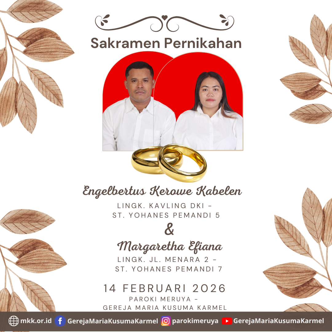 Berikut diumumkan, calon pengantin yang akan mengadakan Sakramen Pernikahan Engelbertus Kerowe Kabelen dengan Margaretha Efiana Pada tanggal 14 Februari 2026 di Paroki Meruya - Gereja Maria Kusuma Karmel.