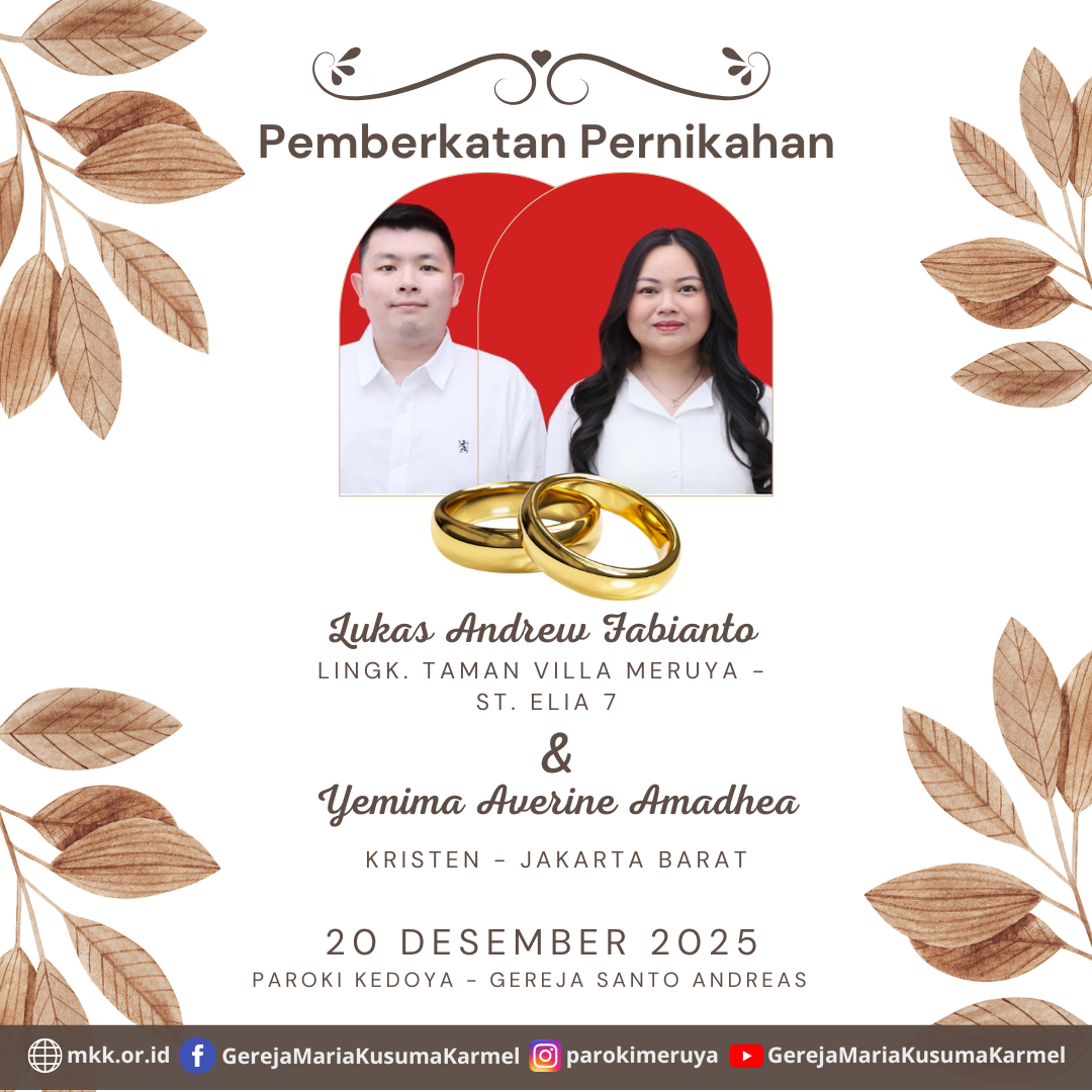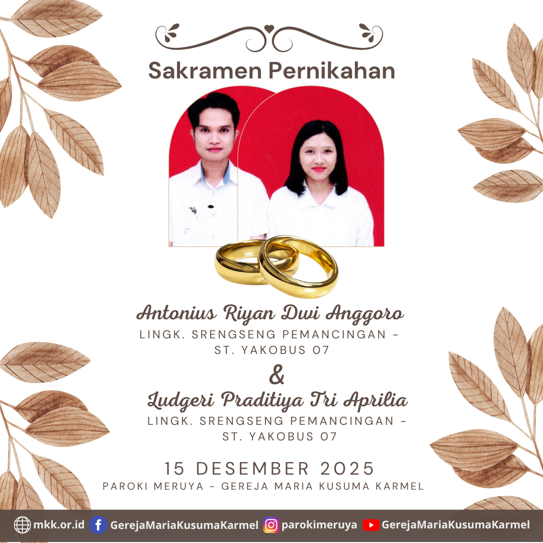 Berikut diumumkan, calon pengantin yang akan mengadakan Sakramen Pernikahan Antonius Riyan Dwi Anggoro dengan Ludgeri Praditiya Tri Aprilia Pada tanggal 15 Desember, 2025 di Paroki Meruya - Gereja Maria Kusuma Karmel.