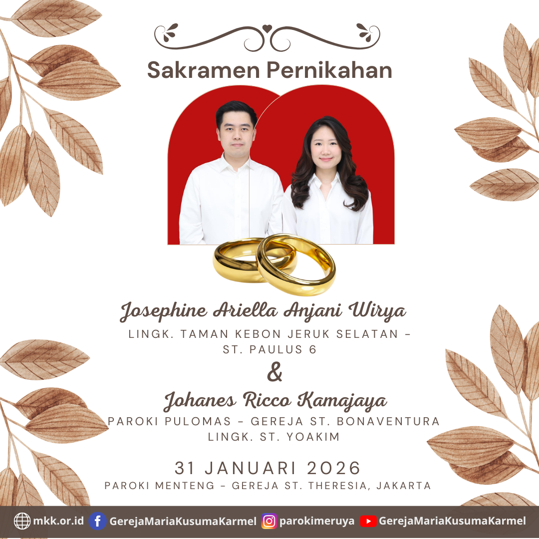 Berikut diumumkan, calon pengantin yang akan mengadakan Sakramen Pernikahan Josephine Ariella Anjani Wirya dengan Johanes Ricco Kamajaya Pada tanggal 31 Januari, 2026 di Paroki St. Theresia, Jakarta. Apabila Umat mengetahui adanya halangan rencana Sakramen Pernikahan tersebut, umat wajib memberitahukan kepada Pastor Paroki. Terima kasih.