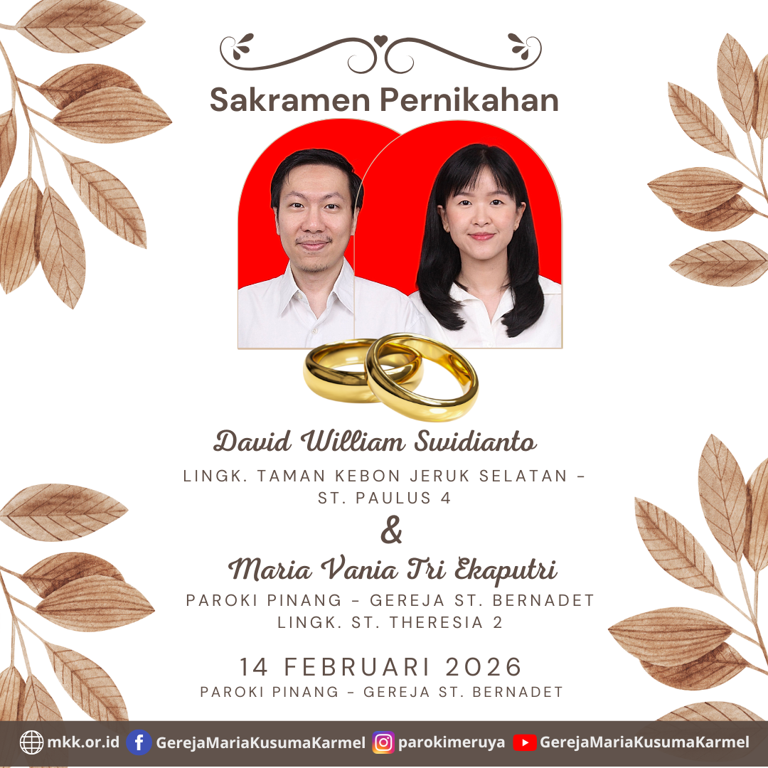 Berikut diumumkan, calon pengantin yang akan mengadakan Sakramen Pernikahan David William Swidianto dengan Maria Vania Tri Ekaputri pada tanggal 14 Februari 2026 di Paroki Pinang - Gereja St. Bernadet.
