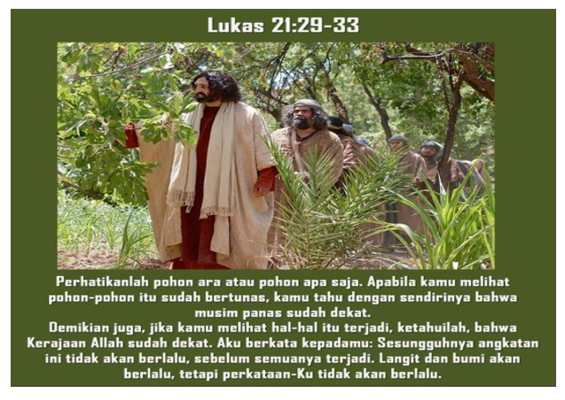 Dalam bacaan ini, Yesus mengajak para murid untuk memperhatikan pohon ara. Ketika pohon itu mulai bertunas, semua orang tahu bahwa musim panas segera tiba. Dengan cara yang sama, Yesus menegaskan bahwa tanda-tanda kehadiran Kerajaan Allah juga dapat dikenali oleh hati yang peka dan waspada.