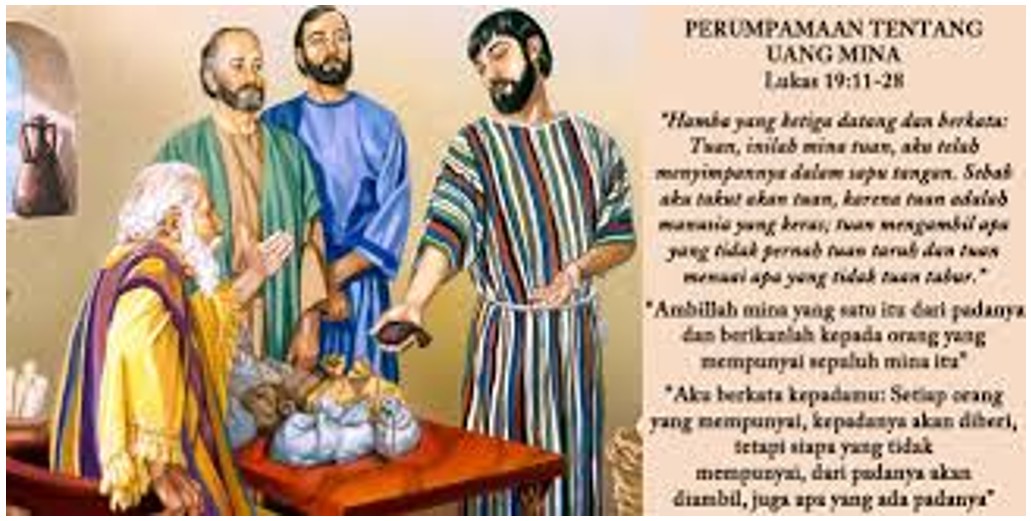 Ada seorang bangsawan yang akan berangkat ke sebuah negeri untuk dinobatkan sebagai raja. Sebelum pergi, ia menitipkan uang 10 mina kepada 10 hambanya. Tuan itu berpesan agar mereka menggunakan uang itu untuk berdagang sampai ia kembali. Sekembalinya, Sang Raja meminta pertanggungjawaban dari mereka. Orang pertama dan kedua melaporkan hal positif karena berhasil memaksimalkan uang itu. Namun, orang ketiga hanya menyimpannya dan mengembalikan kepada raja. Hal itu dilakukannya karena ia takut kepada raja. Alhasil, raja menghukum orang ketiga yang jahat di matanya.