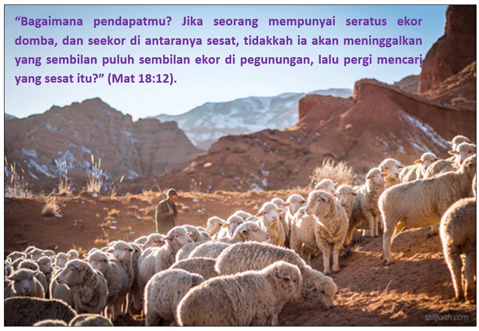 “Demikian pula,” kata Yesus dalam perumpamaan ini, “Bapamu yang di surga tidak menghendaki seorang pun dari anak-anak ini hilang” (ay. 14). Jika ada satu saja yang hilang, ia akan dicari hingga ditemukan. Sebab, ketika ia hilang atau tersesat, ia tidak tahu jalan yang harus ditempuh, jalan yang menuju kepada kawanan domba. Ia membutuhkan seorang penolong, sebab ia tidak bisa menyelamatkan dirinya sendiri. Ia membutuhkan seorang Penyelamat. Penyelamat itu tidak lain adalah Yesus, Dia adalah “Anak Manusia (yang) datang untuk mencari dan menyelamatkan yang hilang” (Luk 19:10).