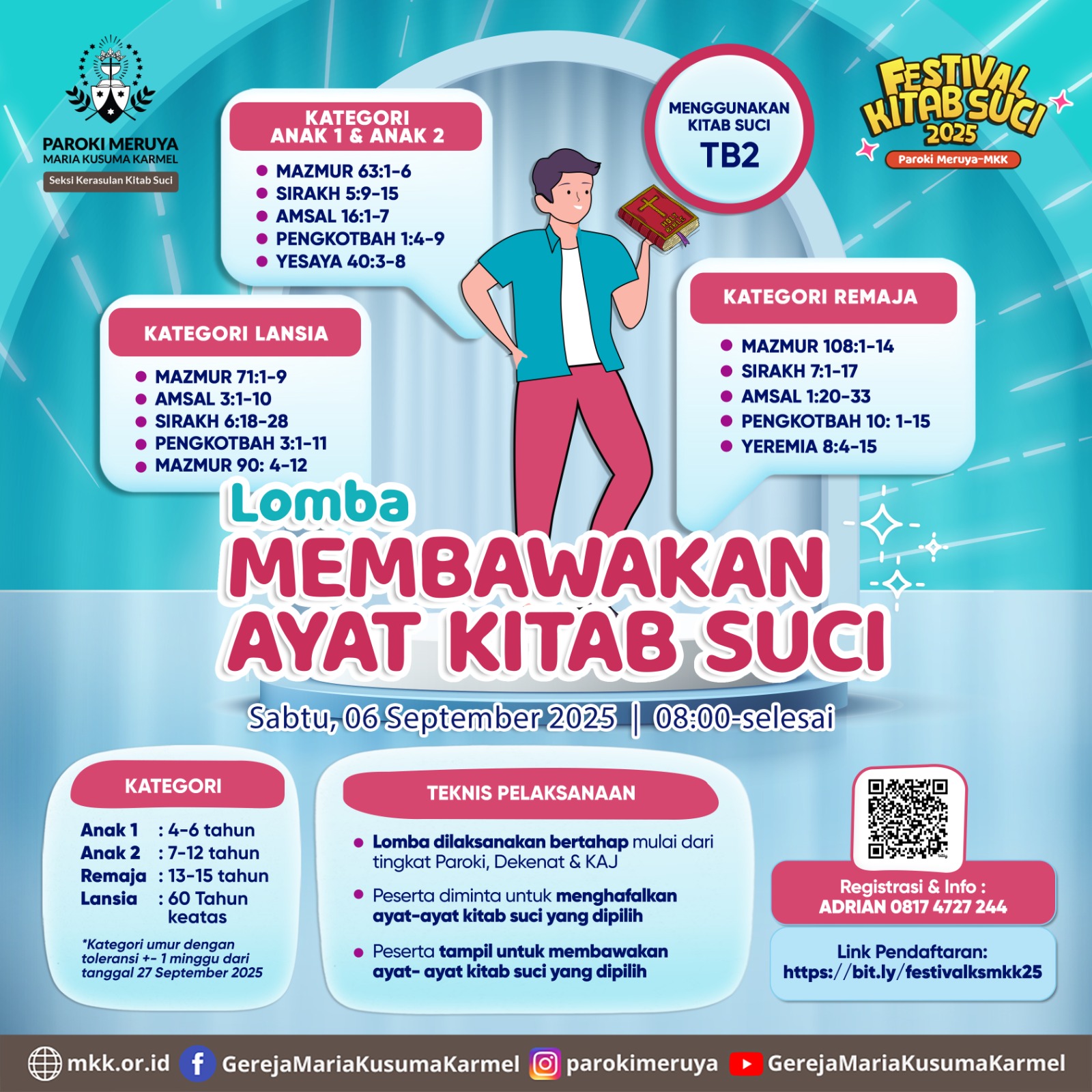 Dalam rangka memeriahkan dan menyambut Bulan Kitab Suci Nasional Tahun 2025, Paroki Meruya mengadakan Festival Kitab Suci 2025, dengan serangkaian kegiatan lomba yang dapat diikuti oleh umat terkasih.