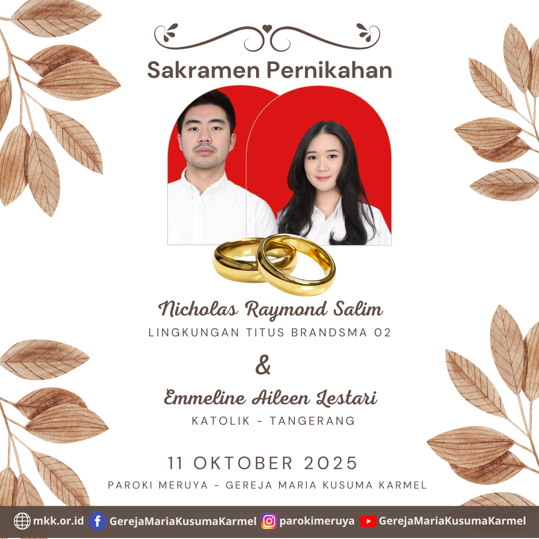 Berikut diumumkan, calon pengantin yang akan mengadakan Sakramen Pernikahan Nicholas Raymond Salim dengan Emmeline Aileen Lestari Pada tanggal 11 Oktober, 2025 di Paroki Meruya - Gereja Maria Kusuma Karmel.