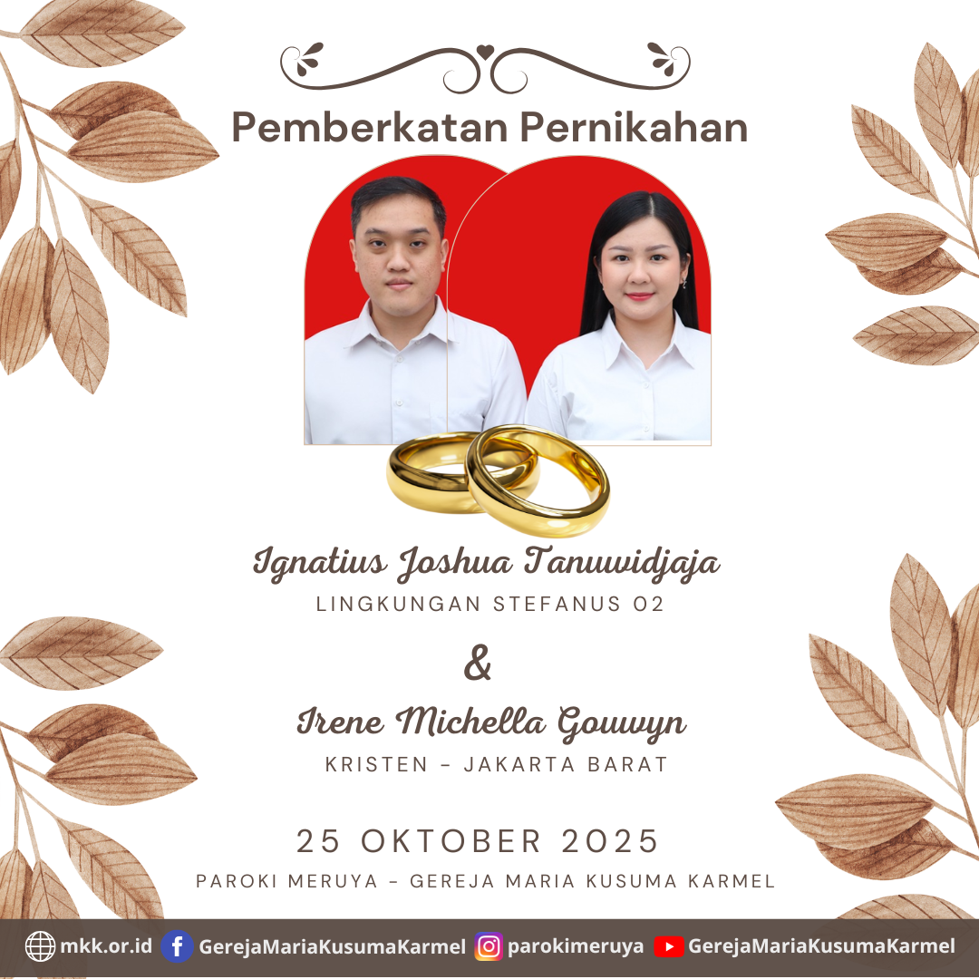 Berikut diumumkan, calon pengantin yang akan mengadakan Pemberkatan Pernikahan Ignatius Joshua Tanuwidjaja dengan Irene Michella Gouwyn Pada tanggal 25 Oktober, 2025 di Paroki Meruya - Gereja Maria Kusuma Karmel.