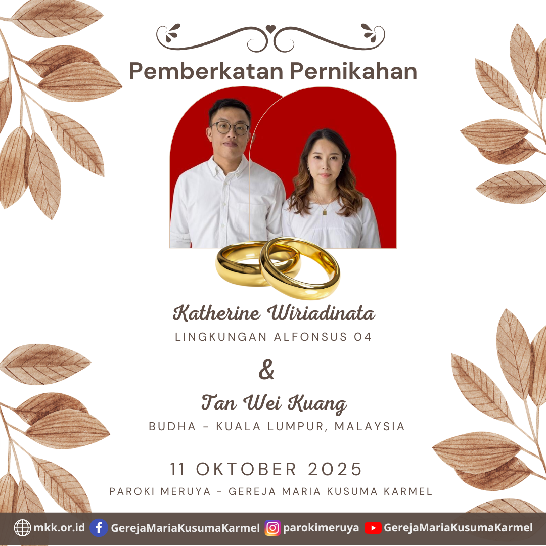 Berikut diumumkan, calon pengantin yang akan mengadakan Pemberkatan Pernikahan Tan Wei Kuang dengan Katherine Wiriadinata Pada tanggal 11 Oktober, 2025 di Paroki Meruya - Gereja Maria Kusuma Karmel.