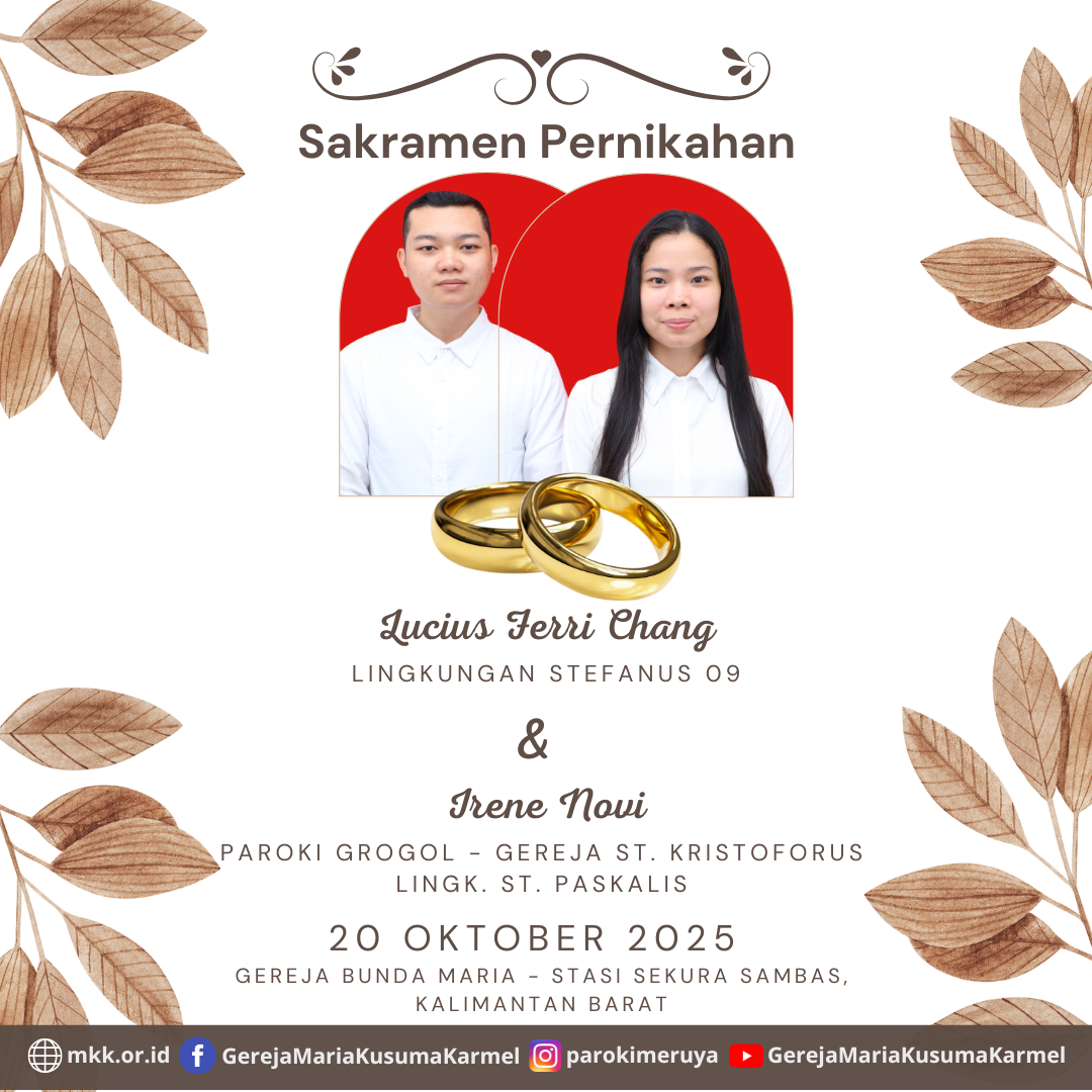 Berikut diumumkan, calon pengantin yang akan mengadakan Sakramen Pernikahan Lucius Ferri Chang dengan Irene Novi Pada tanggal 20 Oktober, 2025 di Gereja Bunda Maria - Stasi Sekura Sambas, Kalimantan Barat.