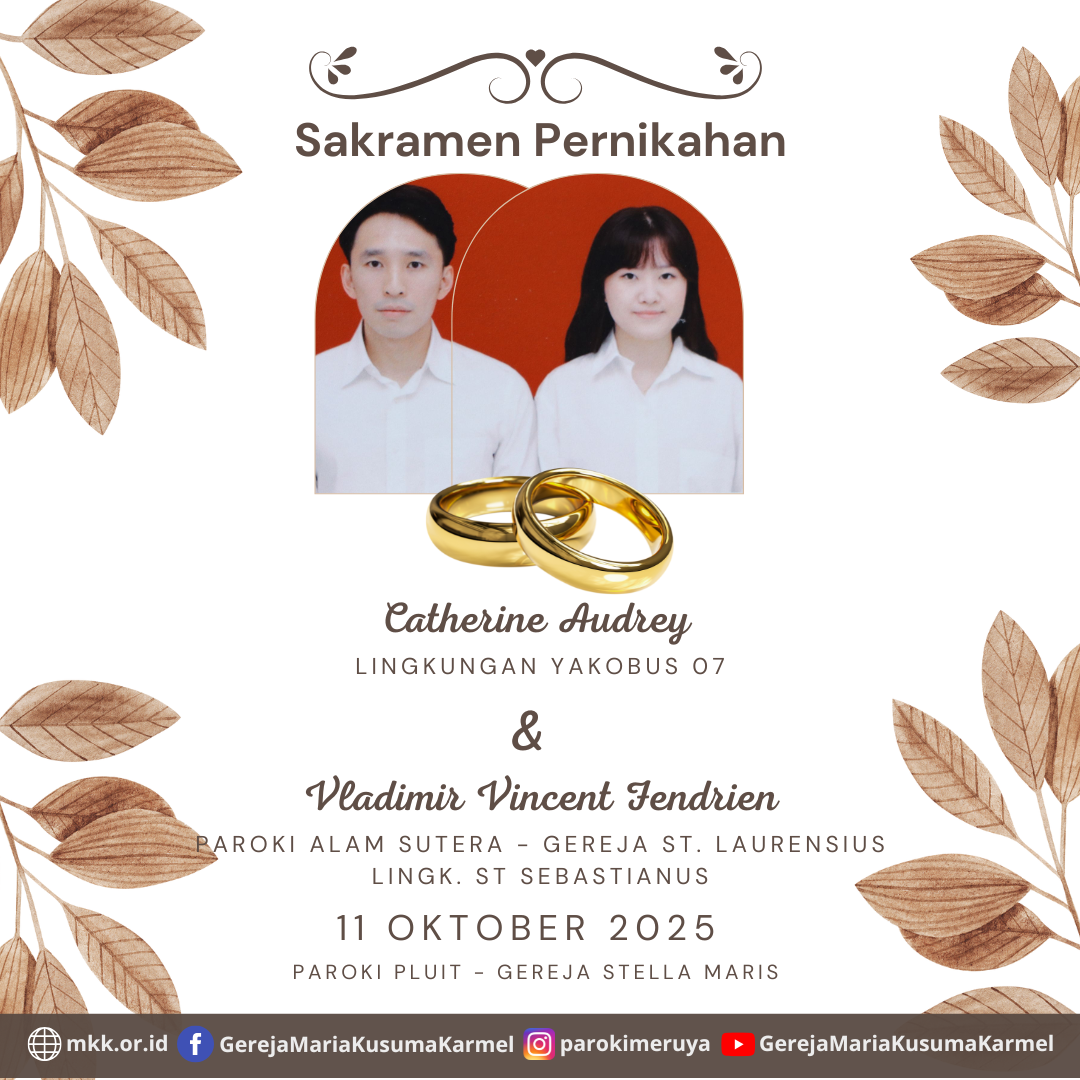 Berikut diumumkan, calon pengantin yang akan mengadakan Sakramen Pernikahan Vladimir Vincent Fendrien dengan Catherine Audrey Pada tanggal 11 Oktober, 2025 di Paroki Pluit - Gereja Stella Maris.