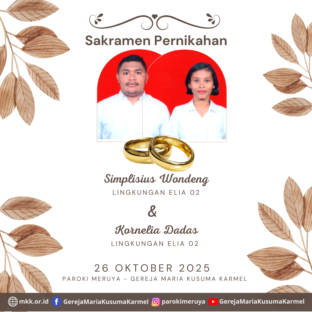 Berikut diumumkan, calon pengantin yang akan mengadakan Sakramen Pernikahan Simplisius Wondeng dengan Kornelia Dadas Pada tanggal 26 Oktober, 2025 di Paroki Meruya - Gereja Maria Kusuma Karmel.