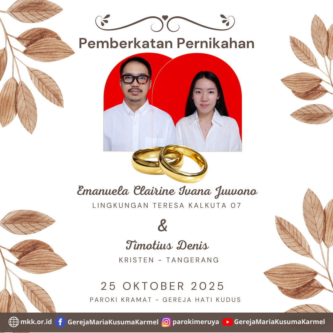 Berikut diumumkan, calon pengantin yang akan mengadakan Pemberkatan Pernikahan Emanuela Clairine Ivana Juwono dengan Timotius Denis Pada tanggal 25 Oktober, 2025 di Paroki Kramat - Gereja Hati Kudus.