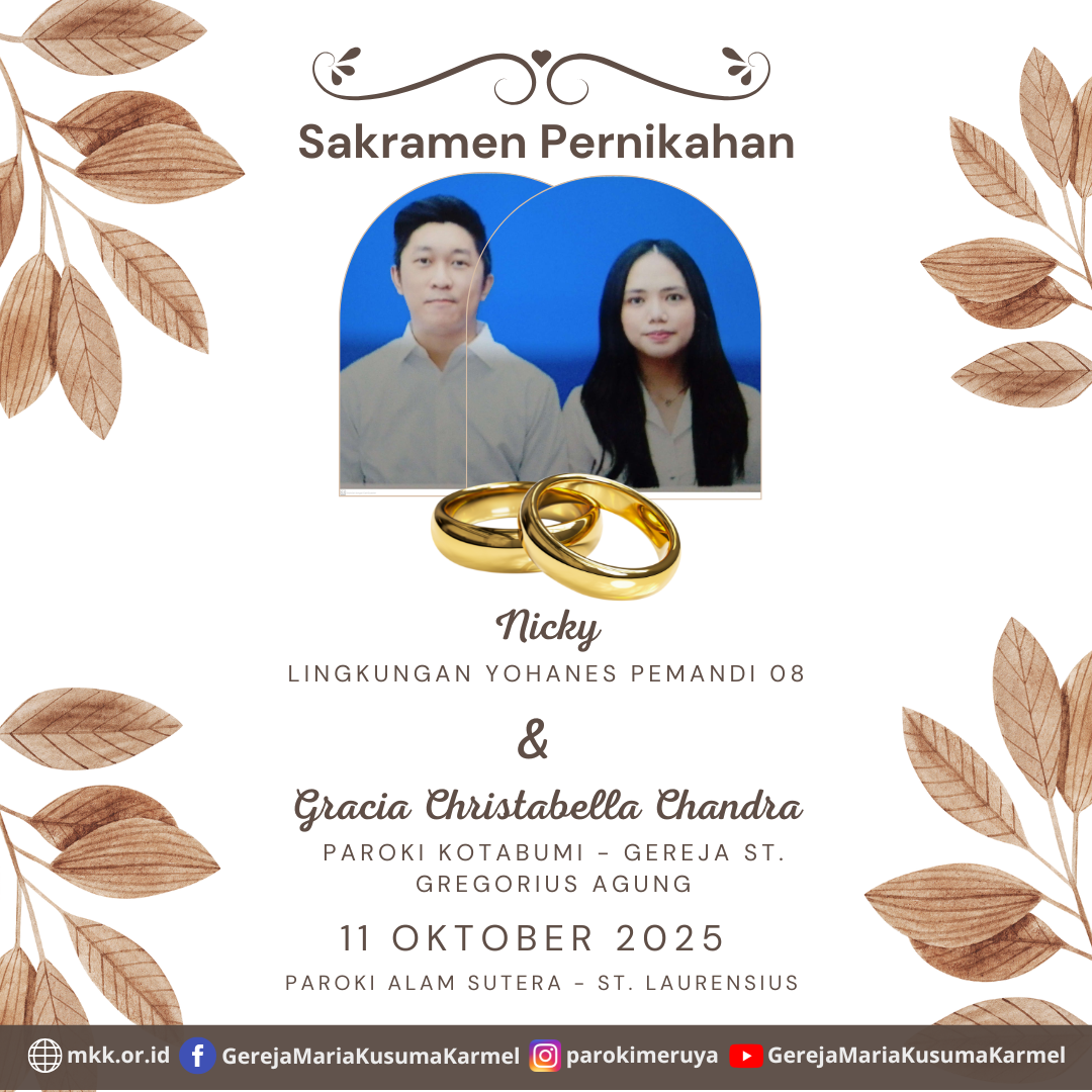 Berikut diumumkan, calon pengantin yang akan mengadakan Sakramen Pernikahan Nicky dengan Gracia Christabella Chandra Pada tanggal 12 Oktober, 2025 di Paroki Alam Sutera - St. Laurensius.