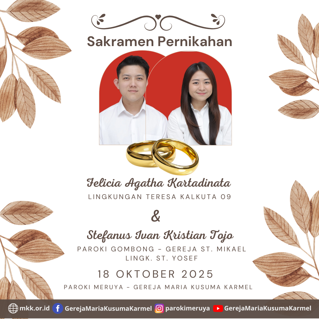 Berikut diumumkan, calon pengantin yang akan mengadakan Sakramen Pernikahan Stefanus Ivan Kristian dengan Tojo Felicia Agatha Kartadinata Pada tanggal 18 Oktober, 2025 di Paroki Meruya - Gereja Maria Kusuma Karmel, Jakarta.