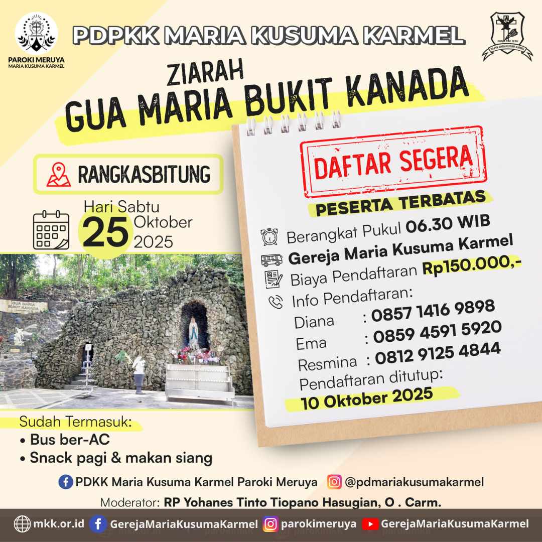 PDPKK-MKK mengadakan Ziarah ke Gua Maria Bukit Kanada, Rangkasbitung pada tanggal 25 Oktober 2025. Keterangan lengkap bisa lihat e-flyer dan pendaftaran bisa scan QR-Code di e-flyer atau klik link https://bit.ly/ZiarahPDMKK2025. Mari kita isi Bulan Rosario dengan berziarah bersama ke Gua Maria Bukit Kanada.