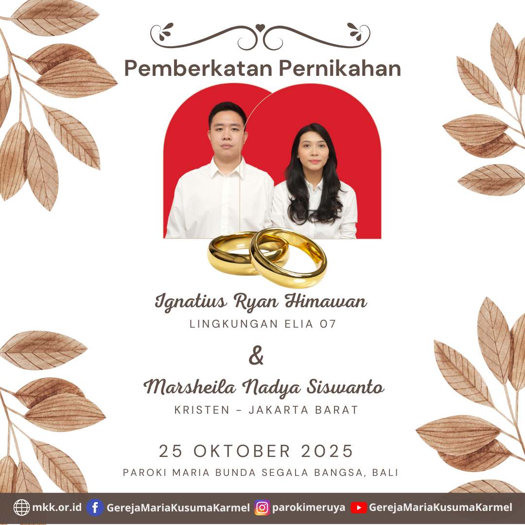 Berikut diumumkan, calon pengantin yang akan mengadakan Pemberkatan Pernikahan Ignatius Ryan Himawan dengan Marsheila Nadya Siswanto Pada tanggal 25 Oktober, 2025 di Paroki Maria Bunda Segala Bangsa, Bali.