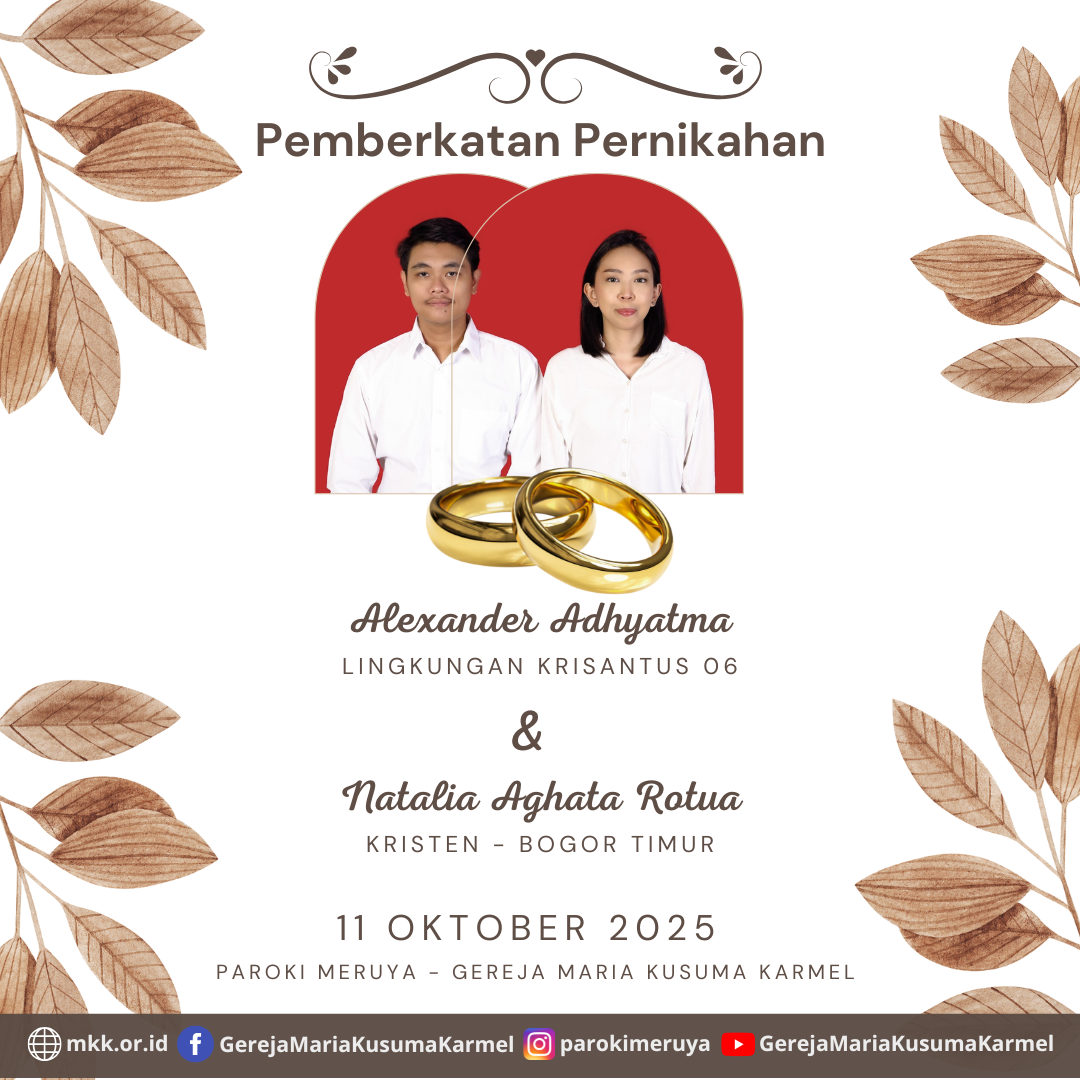 Berikut diumumkan, calon pengantin yang akan mengadakan Pemberkatan Pernikahan Alexander Adhyatma dengan Natalia Aghata Rotua Pada tanggal 11 Oktober, 2025 di Paroki Meruya - Gereja Maria Kusuma Karmel.
