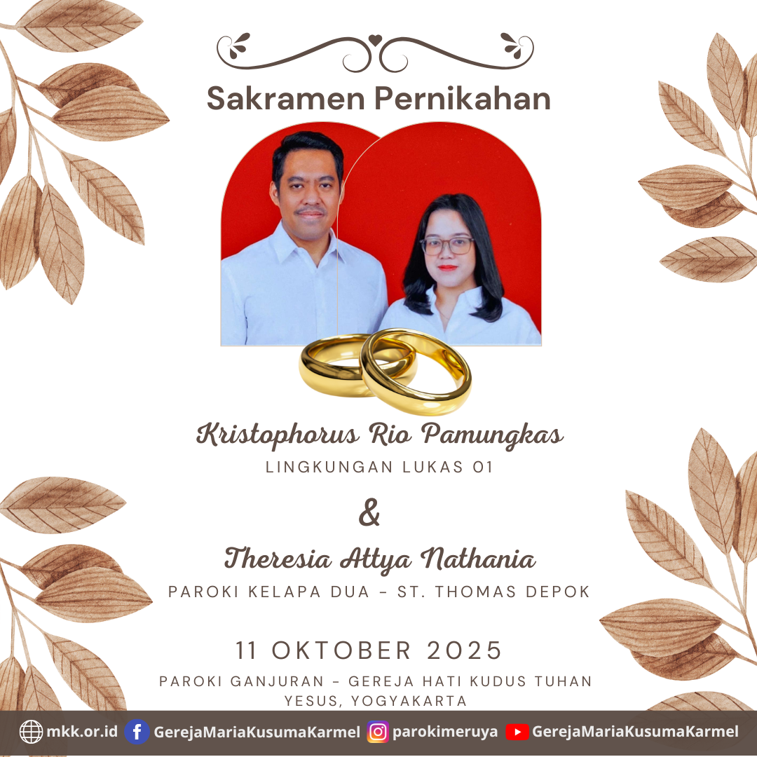 Berikut diumumkan, calon pengantin yang akan mengadakan Sakramen Pernikahan Kristophorus Rio Pamungkas dengan Theresia Attya Nathania Pada tanggal 11 Oktober, 2025 di Paroki Ganjuran - Gereja Hati Kudus Tuhan Yesus, Yogyakarta.