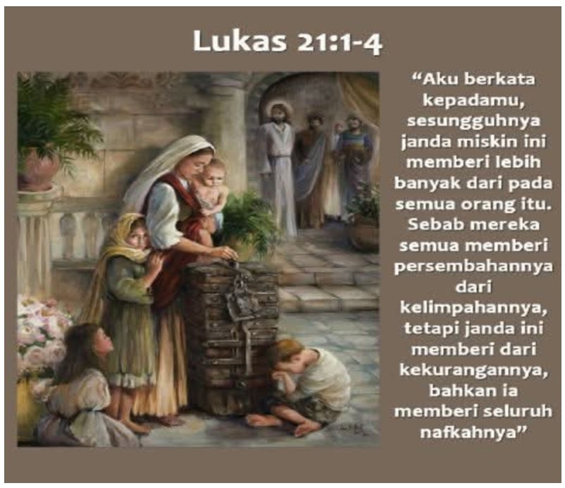 Tidaklah demikian dengan janda miskin dalam bacaan Injil tadi. Dia yang meskipun miskin dan kekurangan mau tetap memberikan apa yang dimilikinya ke dalam peti persembahan di Bait Allah. Pemberian janda tersebut secara nominal memang tidak banyak. Hanya 2 peser atau 2 uang tembaga, yaitu mata uang terkecil di Palestina saat itu. Tetapi 2 peser atau tembaga itu sangat berarti bagi janda miskin itu. Mengapa? Karena hanya uang itu yang ada pada dirinya saat itu. Hanya uang itu yang dimilikinya, yaitu seluruh nafkahnya hari itu. Dengan demikian janda itu merelakan apa yang berharga dalam hidupnya untuk orang lain.
