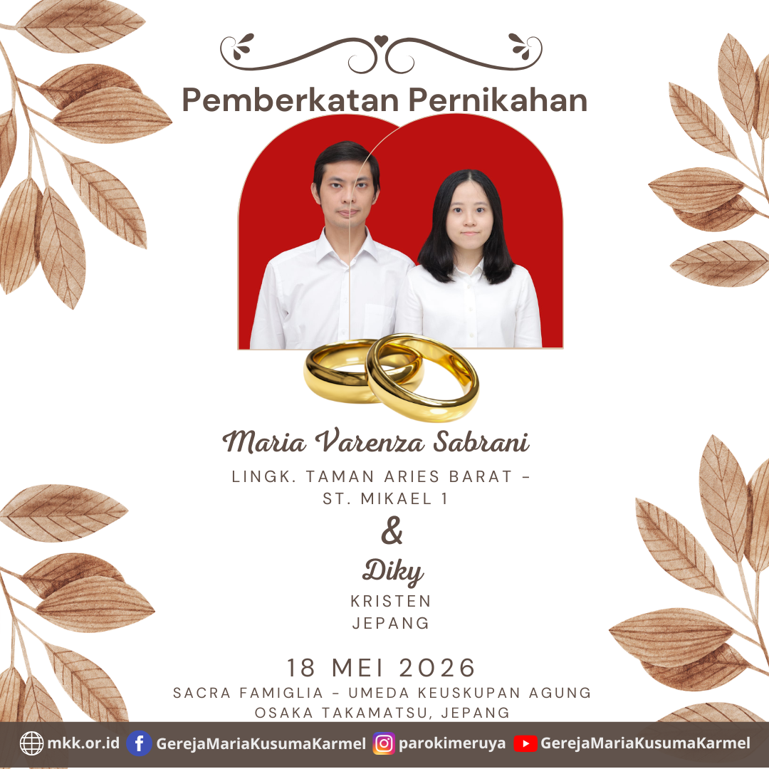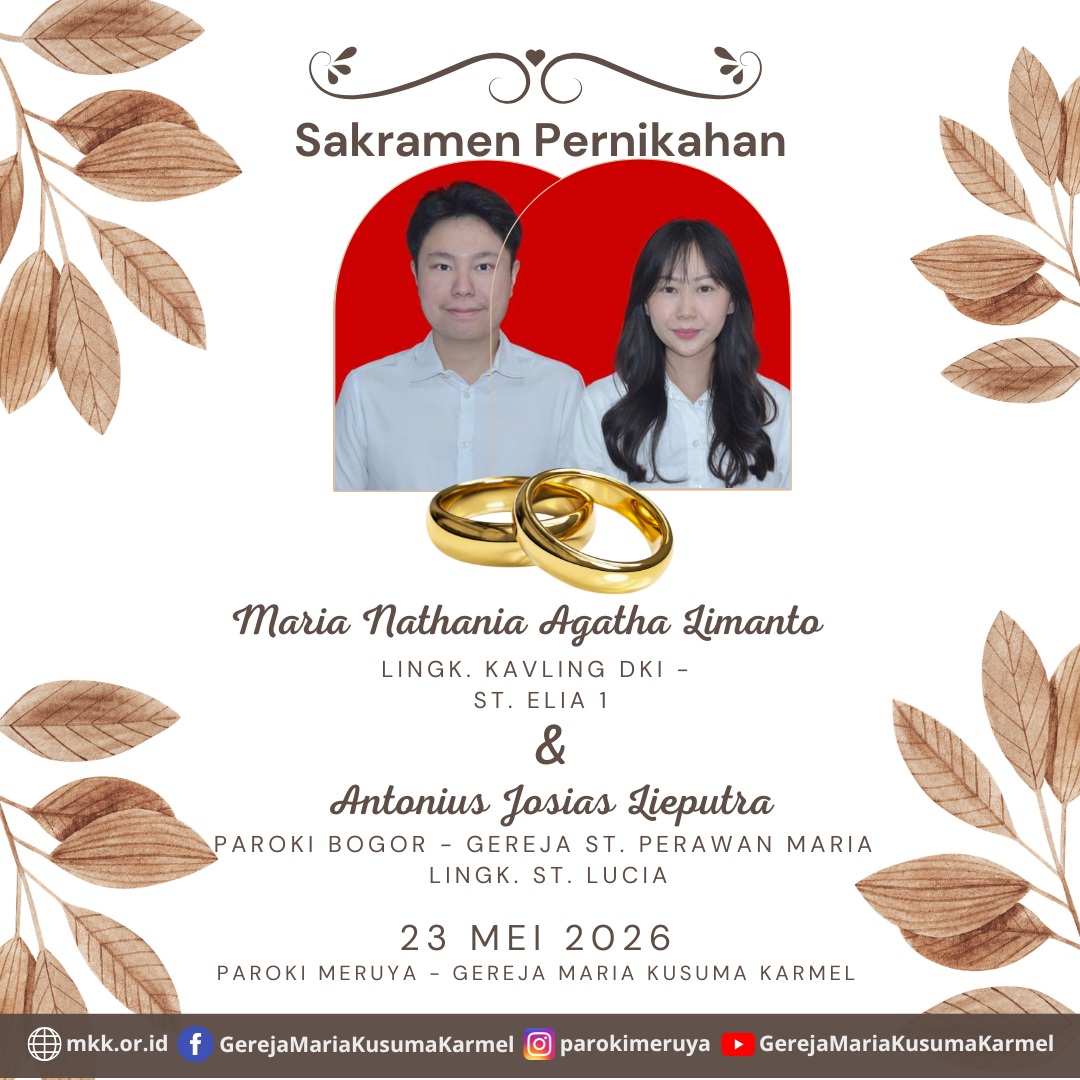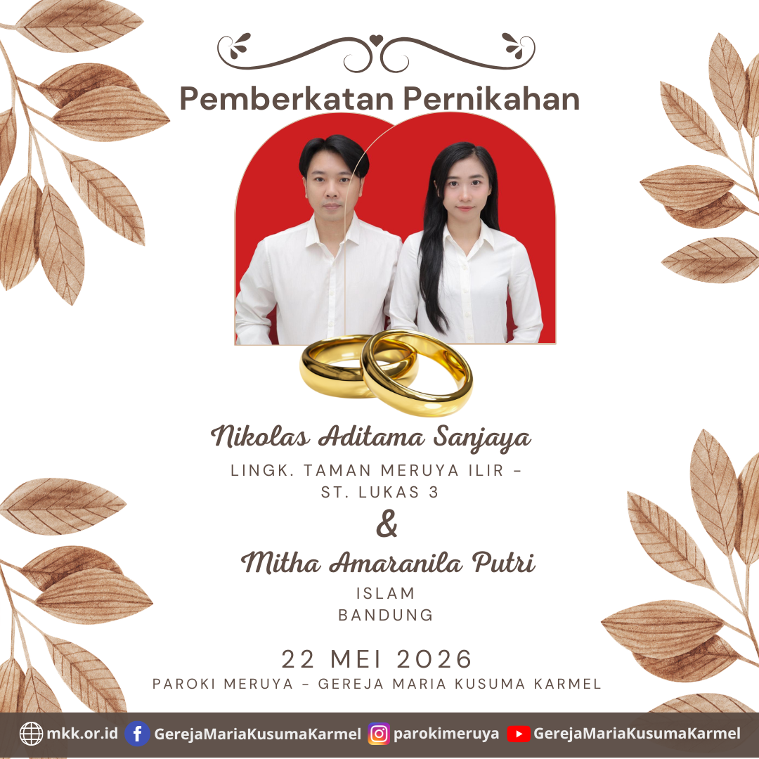 Berikut diumumkan, calon pengantin yang akan mengadakan Sakramen Pernikahan Octavianus Bimo Ardianto dengan Alessandra Rachel Angella Pada tanggal 16 Mei 2026 di Paroki Meruya - Gereja Maria Kusuma Karmel.