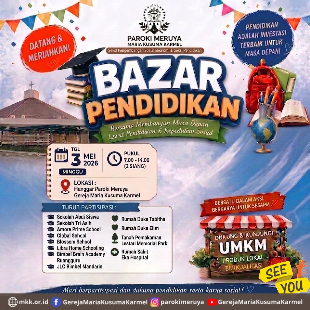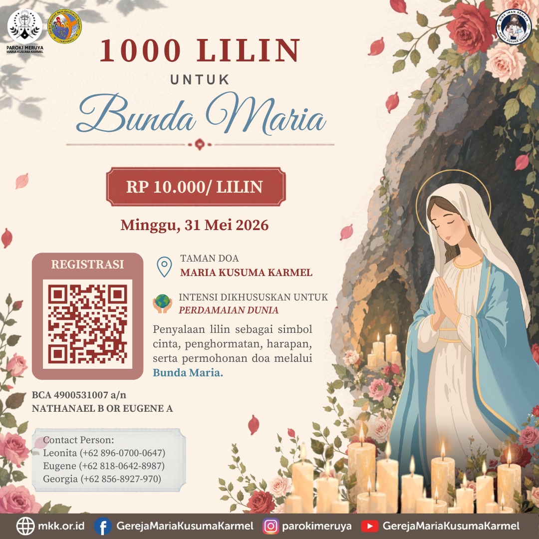 Dengan penuh sukacita, PDPKK MKK mengundang Anda untuk hadir dalam Perayaan Ekaristi Bernuansa Karismatik yang diadakan setiap Sabtu pertama pukul 19.00 WIB di Gereja Maria Kusuma Karmel.